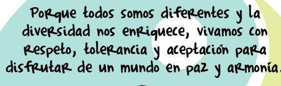 «Porque todos somos diferentes y la diversidad nos enriquece, vivamos con respeto, tolerancia y aceptación para disfrutar de un mundo en paz y armonía»